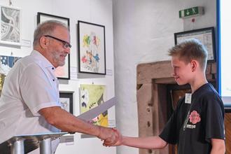 Herr Gieß, 1. Stadtrat aus Erbach, gratuliert Arian zu seinem 1. Preis in der Kategorie Mischtechnik