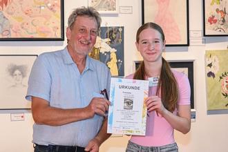 Herr Tietz, 1. Stadtrat von Michelstadt, freut sich mit Franziska über ihren 2. Preis in der Technik Zeichnung