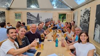 Die Gäste aus allen drei Ländern tauschten Erinnerungen aus, betrachteten alte Fotos und führten neue Gespräche. Höhepunkt war ein gemeinsamer Stadtrundgang mit anschließendem Empfang durch Bürgermeister Dr. Peter Traub im „Europäischen Dorf“ auf dem Wiesenmarkt, wo die Gruppe bei Spezialitäten aus den Partnerstädten willkommen geheißen wurde.