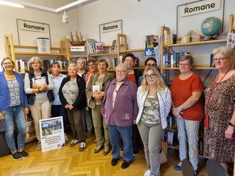 Die Ehrenamtlichen der Kinder-Kleider-Kiste unter Begleitung von Koordinatorin Brigitte Wittmann (links) beim Besuch in der Bücherei, die von Ursula Weiers (2. Von rechts) vorgestellt wurde.