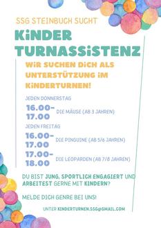 Für unser neues Kinderturnangebot (siehe Bild) suchen wir als Assistenz einen jungen sportlich engagierten Menschen, der gerne mit Kindern arbeitet.