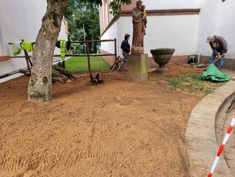 Erbach. Stufe zwei der dreiteiligen Pflanzaktion in der St. Josefs-Ecke neben der Kath. Kirche St. Sophia wurde erfolgreich abgeschlossen. Der Boden ist nun aufgelockert, gereinigt, abgemagert und fertig für den letzten Schritt "Pflanztag". Aktiv waren wieder ehrenamtlich Engagierte aus der Projektgruppe „Lebendiges Erbach - Blühflächen und Insektenhotels“ mit Mitgliedern der Kirchengemeinde, des BUND und der Bücherei St. Sophia, unterstützt durch den Erbacher Bauhof. Die fachliche Leitung hatte Angelika Bonin-Schmidt von der Firma Naturnahe Gärten Schmidt aus Weiten-Gesäß.