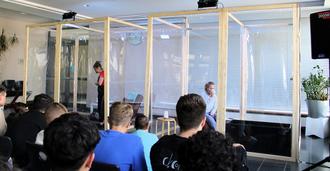 Die Schülerinnen und Schüler der Jahrgangsstufen 8-10 hatten letzte Woche die Möglichkeit, das Zwei-Personen-Stück in zwei großen durchsichtigen Boxen direkt in der Cafeteria der Schule hautnah anzuschauen. Zusätzlich gab es im Vorfeld der Aufführung schulinterne Workshops mit den Darstellerinnen und der Regisseurin, bei denen über das Stück, die Hintergründe und die Thematik der Zukunft gesprochen werden konnte. Die Technik-AG half aktiv beim Auf- und Abbau der Bühneninstallationen und konnte dabei nicht nur den Profis über die Schulter schauen, sondern auch konkrete Einblicke in die Arbeit eines Bühnentechnikers erhalten. Organisiert wurde die Theateraufführung in Kooperation zwischen der Fachschaft Deutsch und FLUX- Netzwerk Theater und Schule.