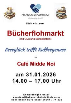 Die Nachbarschaftshilfe Michelstadt e. V. lädt am Samstag, den 31.01.2026, zu einem Bücherflohmarkt im Café Midde Noi ein.