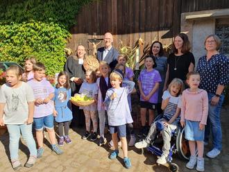 In Form von Trauben und Brot, welche die Grundschulkinder austeilten, erlebten auch die rund 50 Gottesdienstbesucher Erntedank auf sinnliche Weise. Musikalisch gestalteten die Schülerinnen und Schüler sowie Angelika Scharnagl am E-Piano den Hofgottesdienst. Mitglieder des Würzberger Kirchenvorstands hatten gemeinsam mit der gastgebenden Familie und weiteren helfenden Händen den Hof liebevoll festlich geschmückt, etwa mit Ähren, Äpfeln und Kürbissen.