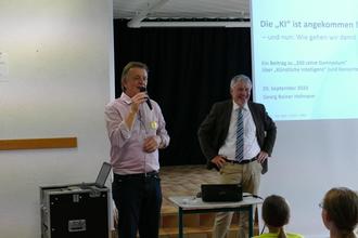 Abgerundet wurde der Nachmittag durch einen unterhaltsamen wie informativen Vortrag von Prof. Dr. Georg Rainer Hofmann von der Technischen Hochschule Aschaffenburg zum Thema „Die KI ist angekommen! – was nun?“, in dem Prof. Dr. Hofmann, der selbst 1981 am Gymnasium Michelstadt das Abitur ablegte, über die Chancen und Möglichkeiten künstlicher Intelligenz informierte, aber auch mit gängigen Vorurteilen aufräumte. Hofmann erklärte den Zuhörerinnen und Zuhörern, dass die künstliche Intelligenz durch Suchmaschinen wie „Google“ bereits Einzug in unseren Alltag gehalten habe und erläuterte, dass man bereits in der ägyptischen Antike, indem man Hunde domestizierte und abrichtete die Idee einer Intelligenz, die ohne menschliches Eingreifen bestimmte Aufgaben erledigt, realisierte. Mit seiner Erklärung über sogenannte pseudo-anthropomorphe Projektionen, bei denen Menschen auch technische Geräte, die über eine Art „Gesicht“ verfügen, wider besseren Wissens unterbewusst als Menschen identifizieren, versetzte Hofmann das Publikum in Erstaunen. Außerdem ging Hofmann auf die Frage nach der Verantwortung für das Handeln künstlicher Intelligenz ein und war im Anschluss an seinen Vortrag gerne bereit, auf die Fragen der Zuhörerinnen und Zuhörer einzugehen. Vielen Dank an Prof. Dr. Hofmann für den interessanten Vortrag.