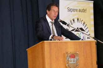 Mit der akademischen Feier, die am Samstagvormittag in der Odenwaldhalle stattfand, wurde das Schuljubiläum in Anwesenheit von Kommunal-, Landes- und Bundespolitikerinnen und Bundespolitikern, Vertreterinnen und Vertretern der Sparkasse Odenwaldkreis, der Industrievereinigung Odenwaldkreis, der Firma Koziol, der Volksbank Odenwald, den Mitgliedern des Schulelternbeirates, den Vorstandsmitgliedern des Schulvereins, der Schülervertretung des Gymnasiums Michelstadt, Gästen der Partnerschulen aus Olevano, Gablonz und Larbert sowie den amtierenden und ehemaligen Mitgliedern der Schulleitung und vielen Schülerinnen, Schülern, Ehemaligen und Lehrkräften feierlich begangen. Schulleiter Richard Knapp begrüßte die Anwesenden sowie die Ehrengäste und insbesondere den Festredner Prof. Dr. Dr. hc Julian Nida-Rümelin sehr herzlich und blickte in seiner Rede auf die Geschichte des Gymnasiums Michelstadt zurück und betonte die humanistische Bildungsidee des Schulgründers Graf Albert von Erbach-Fürstenau noch heute als wesentlichen Teil der Schulphilosophie und des Schulmottos „Sapere aude! Die Menschen stärken - Die Sachen klären - Gemeinschaft erfahren“.