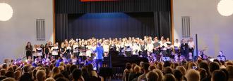 Ein stimmgewaltiger Chor mit rund 180 Sängerinnen und Sängern, Schülerinnen und Schüler, Lehrkräfte, Ehemalige, die teilwiese eine weite Anreise auf sich genommen haben, sowie Freunde des Gymnasiums Michelstadt hatte unter der Leitung des Musiklehrers Thorsten Klingelhöfer-Marquard eigens für das Jubiläumskonzert Stücke einstudiert. Einer der Ehemaligen, Ulf Anneken, ist extra den Weg aus Los Angeles nach Michelstadt angetreten, um an den Feierlichkeiten und dem Jubiläumschor teilnehmen zu können. Anstrengungen, die die große Verbundenheit mit der Schulgemeinschaft des Gymnasiums Michelstadt und den Zusammenhalt beweisen.
