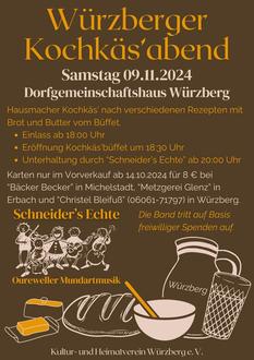 Der Kultur- und Heimatverein Würzberg veranstaltet am Samstag 09.11.2024 wieder einen Kochkäs’abend im Würzberger Dorfgemeinschaftshaus.