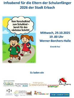 Erbach. Die Erbacher Kindertagesstätten und Grundschulen laden gemeinsam alle Eltern, deren Kinder im Jahr 2026 in Erbach eingeschult werden, herzlich zu einem Infoabend ein. Die Veranstaltung findet am Mittwoch, 29.10.2025, um 19:00 Uhr in der Werner-Borchers-Halle statt.