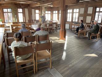 Auf dem Bild zu sehen sind einige der Seniorinnen und Senioren im Sitzungssaal des historischen Michelstädter Rathaus.