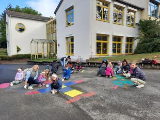 Dadurch gelang es, dass zum einen die Bemalung der Hüpfspiele auf den Pausenhöfen erneuert wurden und nun wieder mit leuchtenden Farben zum Spielen einladen. Zum anderen erhielten die Fahrzeughütte und die Sitzbänke einen neuen Anstrich, um in der Pause genutzt werden zu können.