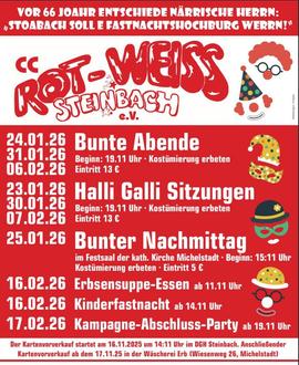 An sechs stimmungsvollen Abenden im Steinbacher Bürgerhaus (3 Halli Galli Sitzungen und 3 klassische Bunte Abende) sowie dem beliebten Bunten Nachmittag im Festsaal der kath. Kirche freuen wir uns auf Euren Besuch. Das Erbsensuppenessen und die Kinderfastnacht runden die Kampagne ab.