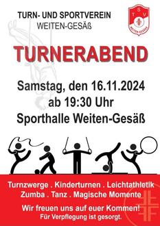 Einladung zum Turnerabend beim TSV Weiten-Gesäß am Samstag, den 16.11.2024, ab 19.30 Uhr in der Sport-und Vereinshalle. Kommen, staunen und genießen. Auf euer Kommen freut sich der TSV. Für Verpflegung