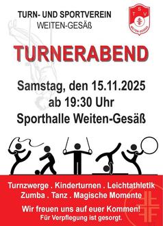 Der TSV Weiten-Gesäß lädt am Samstag, den 15.11.2025 zum Turnerabend in der Sport- und Vereinshalle ein. Kommen, staunen und genießen. Für Verpflegung ist gesorgt, auf euer Kommen freut sich der TSV.