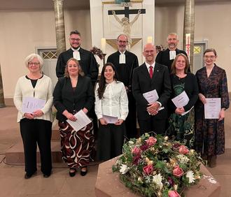 Anne Hechler, Katrin Beisel, Patricia Rostasi, Dr. Michael Trumpfheller, Sandra Suhm und Nina Jährling (vorne von links) sind mit dem Prädikantendienst beauftragt worden von (oben von links) Pfarrer Roland Bahre, Propst Stephan Arras und Dekan Carsten Stein. - Foto: Bernhard Bergmann