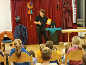 Die Kinder lernen die Geschichte von Theo kennen. Gleich wird Michael Hain sich in Theo verwandeln