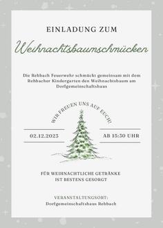 Die Freiwillige Feuerwehr Rehbach schmückt gemeinsam mit dem Rehbacher Kindergarten am 02.12.2023 ab 15:30 Uhr den Weihnachtsbaum am Dorfgemeinschaftshaus in Rehbach. Für weihnachtliche Getränke ist bestens gesorgt!