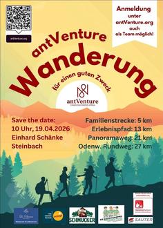 Am 19.04.2026 plant antVenture bereits zum dritten Mal eine Spendenwanderung mit Strecken über 5, 13, 20 und 27 Kilometer auf abwechslungsreichen Wegen durch den Odenwald.