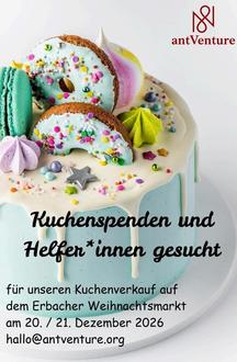 Für den Kuchenverkauf auf dem Erbacher Weihnachtsmarkt werden noch helfende Hände gesucht – sowohl Kuchenbäckerinnen und -bäcker als auch Verkaufshelferinnen und -helfer, insbesondere in der Zeit von 13:30 bis 17:00 Uhr.