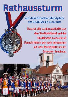 Mit der Erstürmung des Alten Rathauses sowie der Übernahme des Stadtschlüssels beginnt die heiße Phase der Erbacher Fastnacht. Am folgenden Wochenende beginnen die Prunksitzungen des CV-ULK (Freitag 09.02. und Rosenmontag 12.02.) Restkarten für beide Veranstaltungen gibt es im Touristikbüro am Marktplatz oder unter kartenvorverkauf@cvulk.de