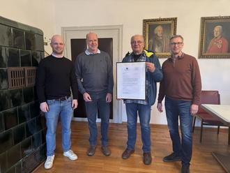 Überreichung der Patenschaftsurkunde v.l. Graf zu Erbach, Heinz Roelle, Michael Reiß, Andreas Heim