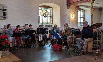 David Forstman´s Erwachsenen-Ensemble der Musikschule Erbach übernahm am Morgen des Dritten Advent in der Stadtkirche Erbach die musikalische Untermalung des gut besuchten Gottesdienstes. Das Ensemble kann seine musikalischen Probestunden u.a. im Gemeindehaus der evangelichen Kirche in Erbach abhalten. Als ein kleines Dankeschön dafür spielte das Ensemble am Sonntag eine Reihe von weihnachtlichen Liedern in der Besetzung mit vier Querflöten, einer Sopran- bzw. Altblockflöte, einem Akkordeon, einem Cellon, zwei Gitarren sowie Perkussion. (cb, 12-2023)