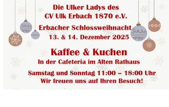 Am dritten Adventswochenende (13. und 14. Dezember) laden die Ulker-Ladys des CV Ulk 1870 Erbach e. V. von jeweils 11 bis 18:00 Uhr in die Cafeteria im Alten Rathaus auf dem Marktplatz ein.