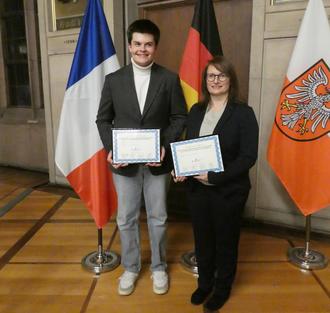 Zum ersten Mal nahm das Gymnasium Michelstadt am diesjährigen 15. Preis der Deutsch-Französischen-Gesellschaft Frankfurt teil, die jährlich die beste Französisch-Schülerin bzw. den besten Französisch-Schüler der Region Rhein-Main kürt. Leonard Bock aus der Ed gelang es mit seiner fiktiven schicksalsbeladenen Lebensgeschichte des jüdischen Kindes Heinrich Frank, das 1935 von seinen Eltern aus Sicherheitsgründen nach Paris geschickt wurde, die Jury zu überzeugen. Er wurde zur Freude aller als einer von vier Finalisten am 22. Januar, dem Tag der deutsch-französischen Freundschaft, zur mündlichen Präsentation der Finalisten in den Frankfurter Römer geladen. Dort stellte Leonard seine Geschichte mit all ihren Facetten, Entstehungsideen und Forschungsergebnissen, zur bis 1996 nicht stattgefundenen Aufarbeitung der französischen Schuldfrage an der Judenverfolgung während der deutschen Besatzung 1940-44, der Jury auf Französisch vor.