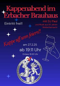 An Weiberfastnacht (Donnerstag 27.02.2025) feiern die Hexen des Carneval-Verein Ulk Erbach ab 19:11 Uhr im Erbacher Brauhaus einen traditionellen Kappenabend. So wie es früher einmal war! Für beste Stimmung sorgt DJ Paul.