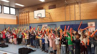 Am Ende des Schultages präsentierten alle Akteure die erarbeiteten Stücke in einem Konzert. Dazu wurden die Kinder der Jahrgänge 3 und 4 als Publikum eingeladen. Konzentriert und stolz trugen die vier Gruppen nacheinander ihre erarbeiteten Lieder vor. Zum krönenden Abschluss des Konzertes kamen noch einmal alle aktiven Kinder gemeinsam auf die Bühne und begleiteten mit Boomwhacker-Akkorden "The Lion sleeps tonight".
