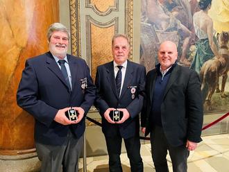 BRK-Aktive setzen Zeichen der Nächstenliebe - Ehre für jahrzehntelange Treue - Bereitschaft Ruhstorf a.d.Rott (v.l.) Herr Günther Gaisbauer (50 Jahre Dienst) und Herr Franz Sentef (50 Jahre Dienst) mit Bürgermeister Andreas Jakob