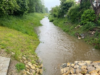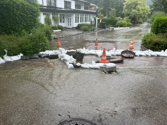 Das Fassungsvolumen des Dorfteiches wurde zwar vor ein paar Jahren erweitert, trotzdem war hier durch den Starkregen kurzfristig Wasser übergelaufen. Die Bauhofmitarbeiter reagierten sofort und öffneten die Kanalschächte, wodurch das Wasser zügig ablaufen konnte.