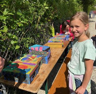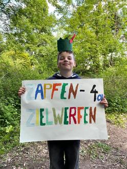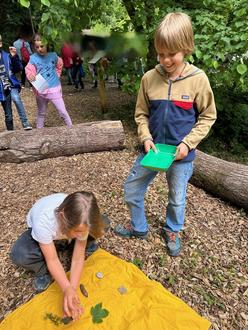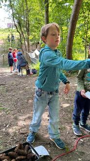 Anschließend gab es viele Stationen, an denen die Schülerinnen und Schüler den Schulwald einmal anders erleben konnten: Zapfen-Zielwerfen, Wald-Memory, Bilder-Schnitzeljagd, Wald-Fühlboxen, Waldtier-Weitsprung, Bäume erfühlen, Bastelstationen für Faltfüchse und für Holzspinner.