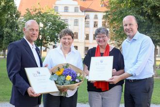 Zunächst übergab Landrat Martin Sailer einen Blumenstrauß an Astrid Zimmermann, die sich als Integrationslotsin seit nunmehr zehn Jahren unermüdlich dafür einsetzt, verbindliche und tragfähige Strukturen für ehrenamtliche Flüchtlingshelferinnen und -helfer im Landkreis Augsburg zu schaffen. Für ihren außerordentlichen Einsatz im Kampf gegen Blutkrebs erhielt im Anschluss Brigitte Lehenberger aus Münster im Nachbarlandkreis Donau-Ries die Erinnerungsmedaille des Landkreises Augsburg. Sie engagiert sich seit 22 Jahren in hohem Maße für die DKMS und hat inzwischen über 400 Registrierungsaktionen – unter anderem am Beruflichen Schulzentrum in Neusäß, am Gymnasium Königsbrunn und am Schmuttertal-Gymnasium in Diedorf – durchgeführt. Als dritte Person wurde Alexander Leupolz aus Königbrunn geehrt. Landrat Martin Sailer überreichte ihm für rund 20 Jahren ehrenamtlichen Einsatz für das Rote Kreuz bei Nothilfeeinsätzen in Kriegs- und Katastrophengebieten im In- und Ausland den Goldenen Ehrenring des Landkreises Augsburg.