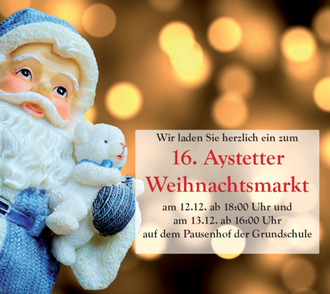 Am Freitag gegen 18:00 Uhr eröffnet der 1. BGM Peter Wendel den Weihnachtsmarkt auf dem Pausenhof der Grundschule. Dazu gibt es erstmals wieder ein Engelesspiel; auch der Schulchor unter Leitung von Frau Raßhofer ist mit dabei. Der Musikverein Aystetten unterhält mit weihnachtlicher Musik. An der Feuerschale werden Geschichten vorgelesen, dazu kann man selbst Stockbrot backen.