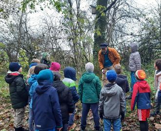 Die AG Schulwald konnte sich am 14.11.23 über den Besuch des Waldpädagogen und Naturlehrers Harald Harazim freuen. Auch das kühle und nasse Wetter konnte die Gruppe nicht davon abhalten, sich in den Schulwald zu begeben und dort allerhand Interessantes über einige Pflanzen und Tiere zu erfahren. Für die Herstellung einer Pfeife wurde aus Holunder- Aststücken das relativ weiche Mark mit Hilfe einer langen Schraube herausgearbeitet. Herr Harazim beeindruckte die Schüler außerdem mit einem imposanten Hirschgeweih und einem Kuh-Horn, das einen lauten und tiefen Ton hervorbringt. Die Kinder freuten sich über den gelungenen Nachmittag.