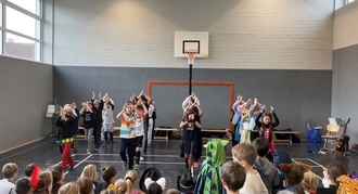 Am rußigen Freitag, dem letzten Tag vor den Winterferien, feierten alle Kinder zusammen eine kleine Faschingsparty in der Turnhalle der Schule. Der Chor der Grundschule lud zu einem kleinen Mitmach-Faschingskonzert ein. Dabei tanzten auch alle Schüler gemeinsam zu "Good night, ladies" und "Baby Shark". Die Klasse 4 a führte auch noch den Song "Wellerman" auf.
