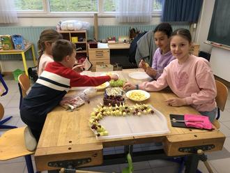 Am 11.02.2025 fand die gesunde Pause für die gesamte Schule statt. Die dritten Klassen haben gemeinsam mit einigen Eltern diverse Leckereien vorbereitet. Es gab Wraps, belegte Brote, kreative Spieß-Variationen und Müsli mit Obstsalat. Es hat allen sehr gut geschmeckt.