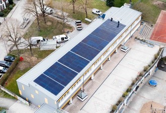 Da der Gemeinderat zugleich den Ausbau der erneuerbaren Energien für die gemeindlichen Liegenschaften einstimmig beschlossen hat, wurde das Schulgebäude im Anschluss der Pflasterarbeiten mit einer Photovoltaik-Anlage in Verbindung mit einem 30kWh-Speichersystem durch die Firma Jungbauer aus Kutzenhausen ausgestattet. Die Anlage aus deutscher Herstellung mit einer Gesamtgröße von 425 m² ist mit insgesamt 180 Glas-Glas Solarmodulen ausgestattet und besitzt eine Gesamtleistung von 67,5 kW. Die Gesamtkosten der Photovoltaik-Anlage betragen rund 84.000,- €. Diese dient der Stromerzeugung für den Eigenverbrauch von Grundschule, Kindergarten und Gemeindeverwaltung. Der über den Eigenbedarf hinaus erzeugte Strom wird in das öffentliche Stromnetz eingespeist. Mit dieser Aufrüstung trägt die Gemeinde Aystetten zu einer klimafreundlichen und autarken Energieversorgung bei.