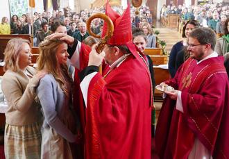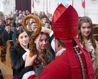 Weihbischof Wolfgang Bischof spendete den jungen Christen aus Inzell und Weißbach nicht nur die Firmung, sondern hatte auch für jeden Firmling einige persönliche Worte übrig. Hier Firmling Marie Hobmaier mit Patin Michaela Aschauer.