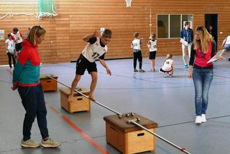 Eine Station beim PZW Test ist das Balancieren über die Langbank und anschließend drei Reckstangen. Gleichgewicht ist in nahezu jeder Sportart wichtig und deshalb wird diese Übung auch abgeprüft.