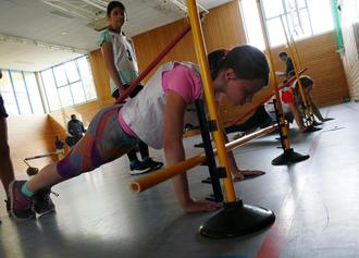 Beim Liegestütz kommt es darauf an, mindestens neun Stück zu schaffen, um eine sehr gute Leistung zu erreichen. Hier versuchten das im letzten Jahr Luna Heinle (vorne) und Emma Engelhardt, beide Eisschnellläuferinnen vom DEC Inzell.