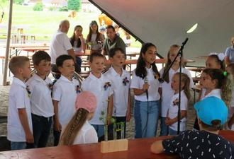 Ein ukrainisches Mädchen der Inzeller Willkommensklasse sprach bewegende Dankesworte an die Schule und die Inzeller Bürger für die gute Aufnahme im Ort. Anschließend trugen die Willkommenskinder gemeinsam mit ihrer Lehrerin Maria Rimskaya und unter musikalischer Begleitung von Musikschullehrer Tim Blagrave ein ukrainisches Danklied vor. Dieses Lied eröffnete dann zugleich auch den offiziellen Teil des diesjährigen Schulfestes.