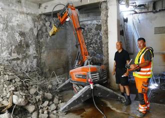 Für die Entkernung der Kellerräume wurde nun kurzfristig ein Abrissroboter angeschafft. „Gerade die Arbeiten im Keller sind sehr gefährlich und man muss immer aufpassen, dass nichts einstürzt. Deswegen haben wir nun den Abrissroboter, der das Ganze ungemein erleichtert und auch von einer gewissen Entfernung gut zu bedienen ist“, erklärt Nikolaus Sterr. Die Kellerräume bleiben zwar erhalten, doch müssen vollständig entkernt werden für die neuen Anlagen zum Hallenbad.