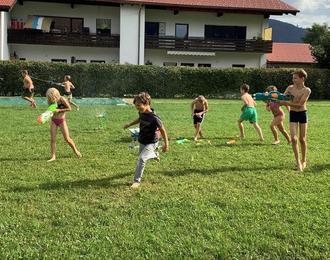 Bei Schulleiterin Elke Thurmayr wurde es richtig nass. Wasserspiele und Experimente mit dem kühlen Nass standen bei ihr auf dem Programm. Dazu gehörte unter anderem das Basteln von wieder verwendbaren Wasserbomben, der Wasserlauf durch den schenkenden Wasserstrahl, eine lustige Wasserschlacht sowie abschließend das Verzehren von Wassermelonen und Wassereis. Badekleidung, Sonnencreme und Handtuch waren bei dieser Station Voraussetzung und wurden auch dringend benötigt.