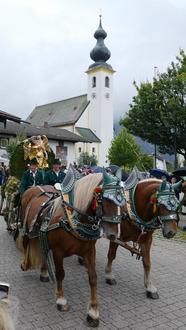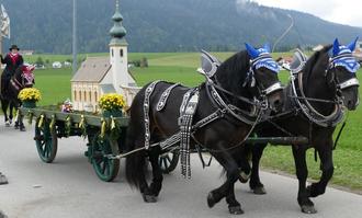 Ein sehr beliebtes Motiv für Besucher und Fotografen ist in jedem Jahr der Wagen mit dem Modell der Inzeller Pfarrkirche St. Michael, das von den beiden Pferden beim Inzeller Michaeliritt mitgezogen wird.