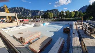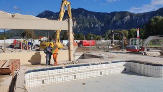 Obwohl der Abriss noch nicht ganz beendet ist, hat die Firma Rottenmoser & Karau GmbH mit den Aufbauarbeiten zum Neubau bereits begonnen. Aktuell sind die Betonarbeiten für den Bistrobereich des neuen Schwimmbades in vollem Gang. „Zunächst müssen wir die notwendigen Sockel und die Kellerwände betonieren, ehe es dann weitergehen kann“, erklärt Vorarbeiter Johann Plenk, der mit seinen Leuten darauf bedacht ist, den Zeitplan möglichst einzuhalten. Eröffnung soll schließlich schon Ende nächsten Jahres sein.