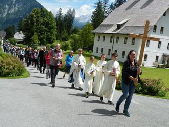 Bei idealem Pilgerwetter zogen die Ruhpoldinger Wallfahrer, allen voran das Pilgerkreuz mit Ministranten und Pfarrer Otto Stangl, zum Bitt- und Dankgottesdienst in die barocke Kirche Maria Kirchental ein