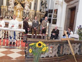 Etwa Hundert Pilger nahmen an der Pfarrwallfahrt nach Maria Kirchental in den benachbarten Pinzgau teil. War man im vergangenen Jahr sinnbildlich noch mit „Josef, dem Ziehvater Jesus‘ auf dem Weg“, so stand die diesjährige Wallfahrt im Hinblick auf das aktuelle Weltgeschehen unter dem bezeichnenden Leitsatz „Herr gib uns deinen Frieden“. Erstmals wurde zusätzlich zu den Fußmärschen auch eine Radlwallfahrt angeboten, die von der Kirche St. Valentin in Zell aus startete. Der anstrengendste und über neun Stunden dauernde Pilgergang führte am Staubfall vorbei hinüber ins Heutal und über die Loferer Alm und den Tiroler Steig ans Ziel, während diejenigen Wanderer, die sich von Schneizlreuth und von Reith aus entlang der Saalach auf den Weg machten, sich die schweißtreibenden Höhenmeter ersparten. Auf allen Strecken gab es an markanten Punkten einzelne Besinnungsstationen, die zur Rast und zugleich zur inneren Einkehr einluden. Die Meditationstexte und Betrachtungen, die von Claus Pichler, Pastoralreferent Georg Gruber, Pfarrer Otto Stangl und Pfarrgemeinderatsvorsitzenden Manfred Hartl vorgetragen wurden, drehten sich selbstredend um Frieden in der Welt, in Gesellschaft und Kirche, in der Familie sowie der eigenen Friedensfindung. Ausgewählte Lieder und Gebete begleiteten die Pilger auf ihren weiteren Etappen. Den von Pfarrer Otto Stangl zelebrierten Bitt- und Dankgottesdienst, umrahmte der Kirabiche-Viergsang mit gefühlvoll intonierten Marienliedern aus dem alpenländischen Fundus. Begleitet wurde das stimmgewaltige Quartett dabei von Gabi Reiserer an der Gitarre. Für den reibungslosen Altardienst sorgten die jungen Ministranten Florian Scharf sowie Verena und Jakob Englisch, als Lektoren fungierten Manfred Hartl und Kolping-Vorsitzender Josef Kiefl. Nicht fehlen durfte das Wallfahrer-Kreuz, das während der Messe den Volksaltar zierte. Seit dem Jahr 1999 gehört es, im Wechsel getragen, zum festen Bestandteil des Pilgergangs.